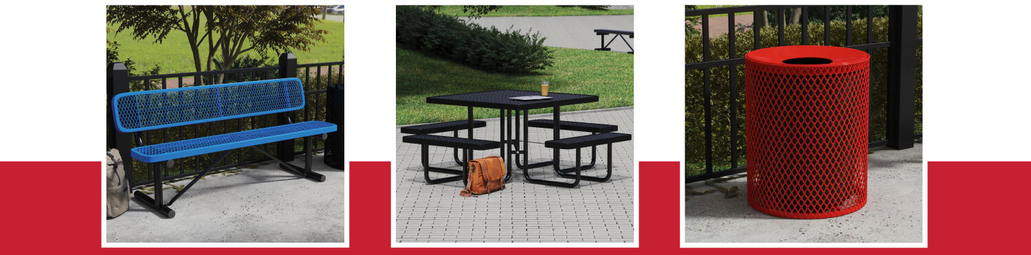 Our standard expanded metal benches are very popular models that can go anywhere and look sharp. The dripless thermoplastic coating looks fantastic even as it protects the steel from rusting.